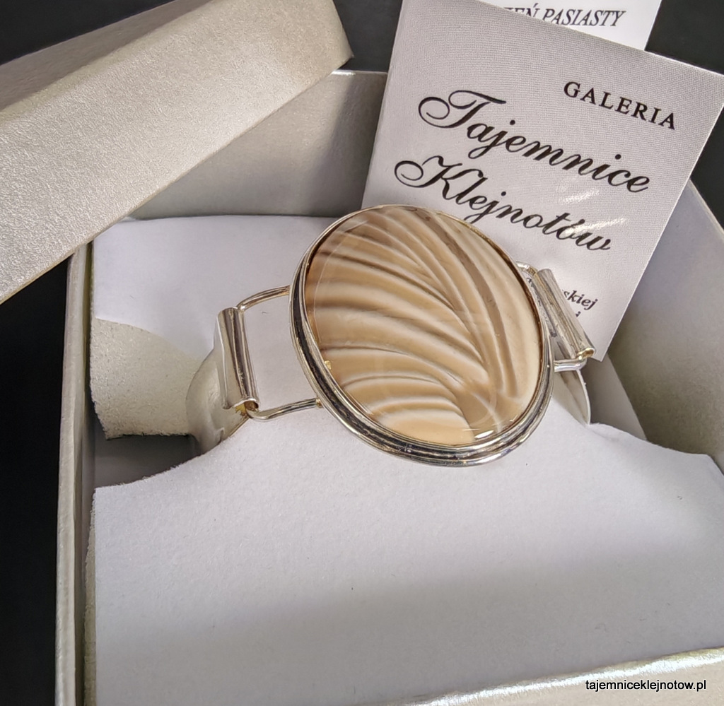 Bransoleta srebrna z krzemieniem pasiastym wykonana jest ręcznie w pojedynczym egzemplarzu z owalnego kaboszonu oprawionego w polskie srebro próby 925. Biżuteria nie zawiera niklu i chromu. Krzemień pasiasty jest materiałem cenionym za swoją niezwykłą wzorzystość i wysoką twardość. Ten pochodzący z Gór Świętokrzyskich kamień już w neolicie służył do wytwarzania ozdobnych przedmiotów o znaczeniu obrzędowym.
