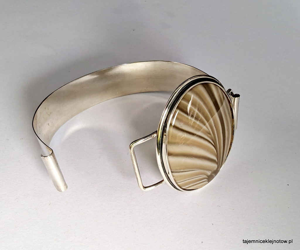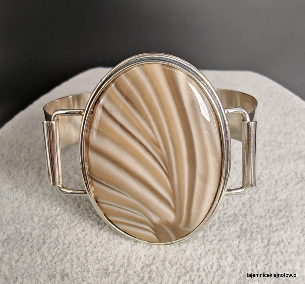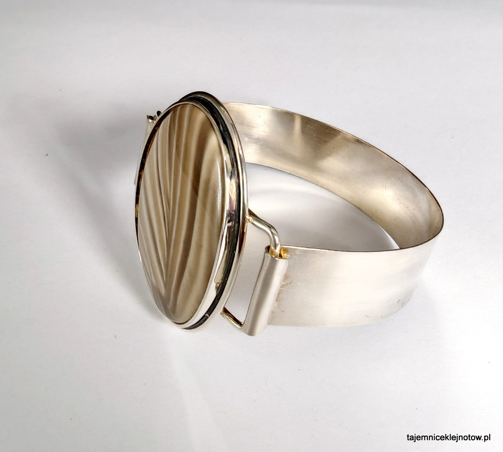 Srebrna bransoleta zdobiona owalem z krzemienia pasiastego. Produkt wykonany w całości ręcznie z polskiego srebra próby 925. Piękny wzór i szlif na  kamieniu. Łatwe zapięcie, bransoleta sprężynująca.