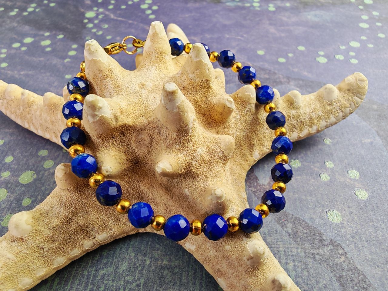 Bransoletka na gumce jubilerskiej z fasetowanymi koralikami z lapisu lazuli, przekładanymi kuleczkami w kolorze złotym. Długość bransoletki to 17,7 cm. Zapięcie w kolorze złotym.