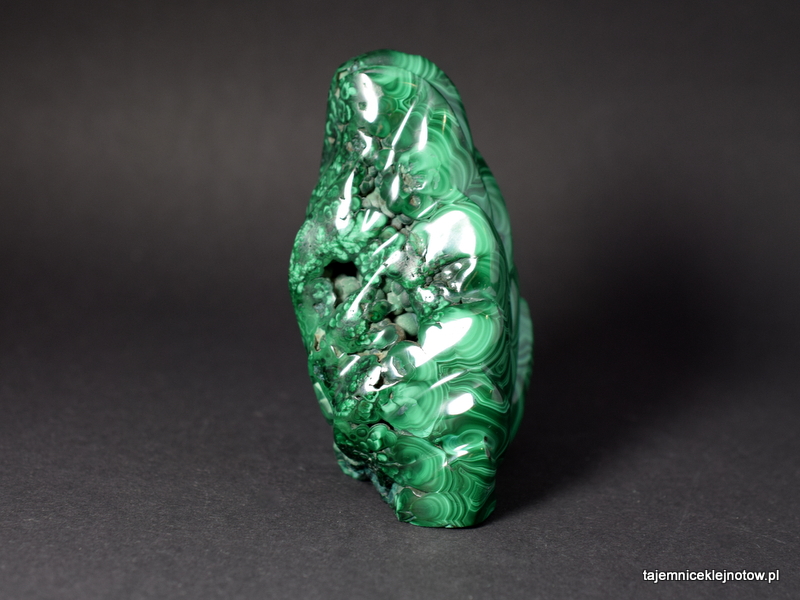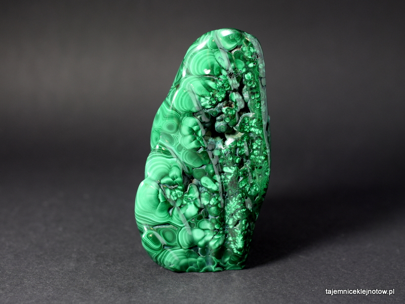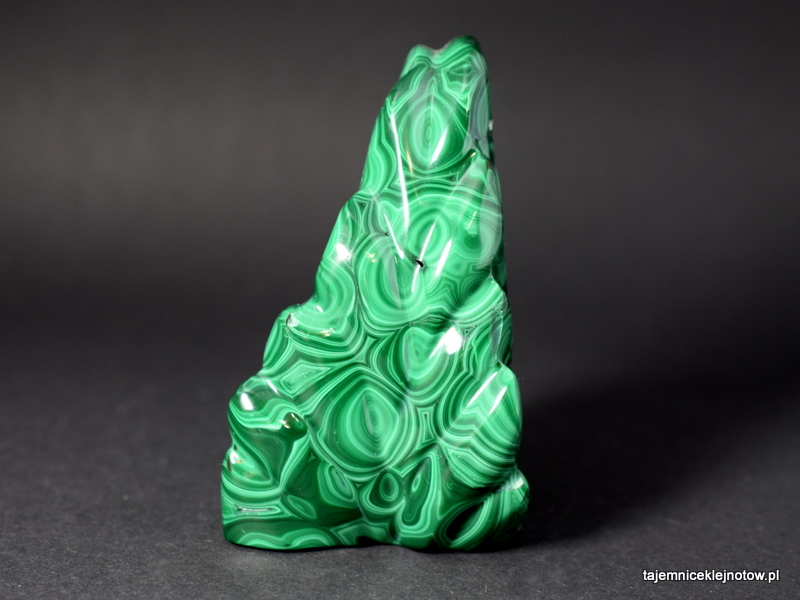 Okaz rzeźbionego, polerowanego malachitu do postawienia. Przypomina płomień, choinkę. Malachit to minerał z gromady węglanów, a dokładnie zasadowy węglan miedzi. Należy do minerałów kruchych i miękkich (twardość 3,5-4 w skali Mohsa). Krystalizuje w strefach utleniania kruszców miedzi, bardzo często w towarzystwie azurytu i chryzokoli. Zielone zabarwienie jest wynikiem zawartości miedzi.