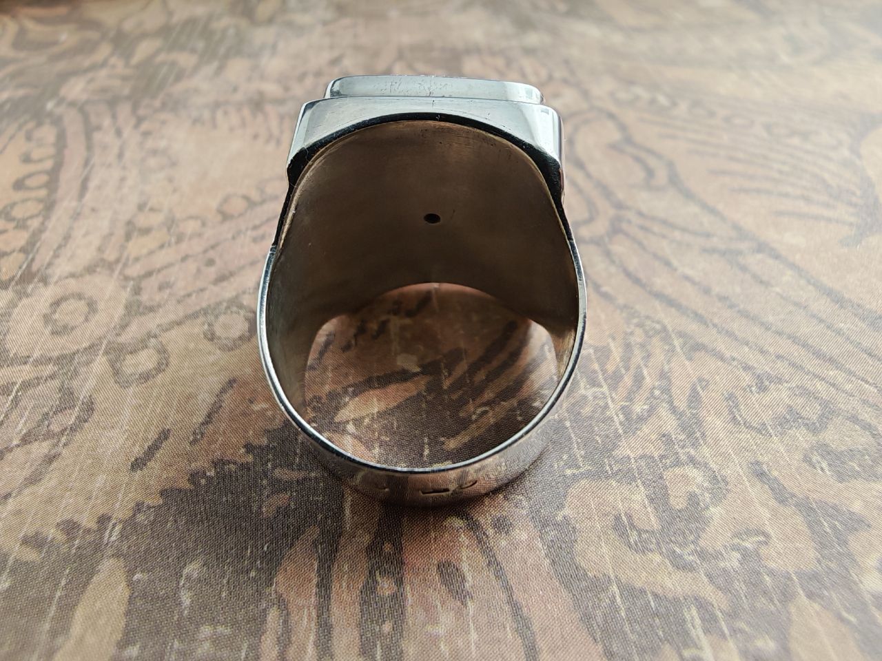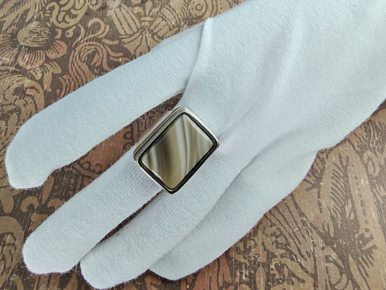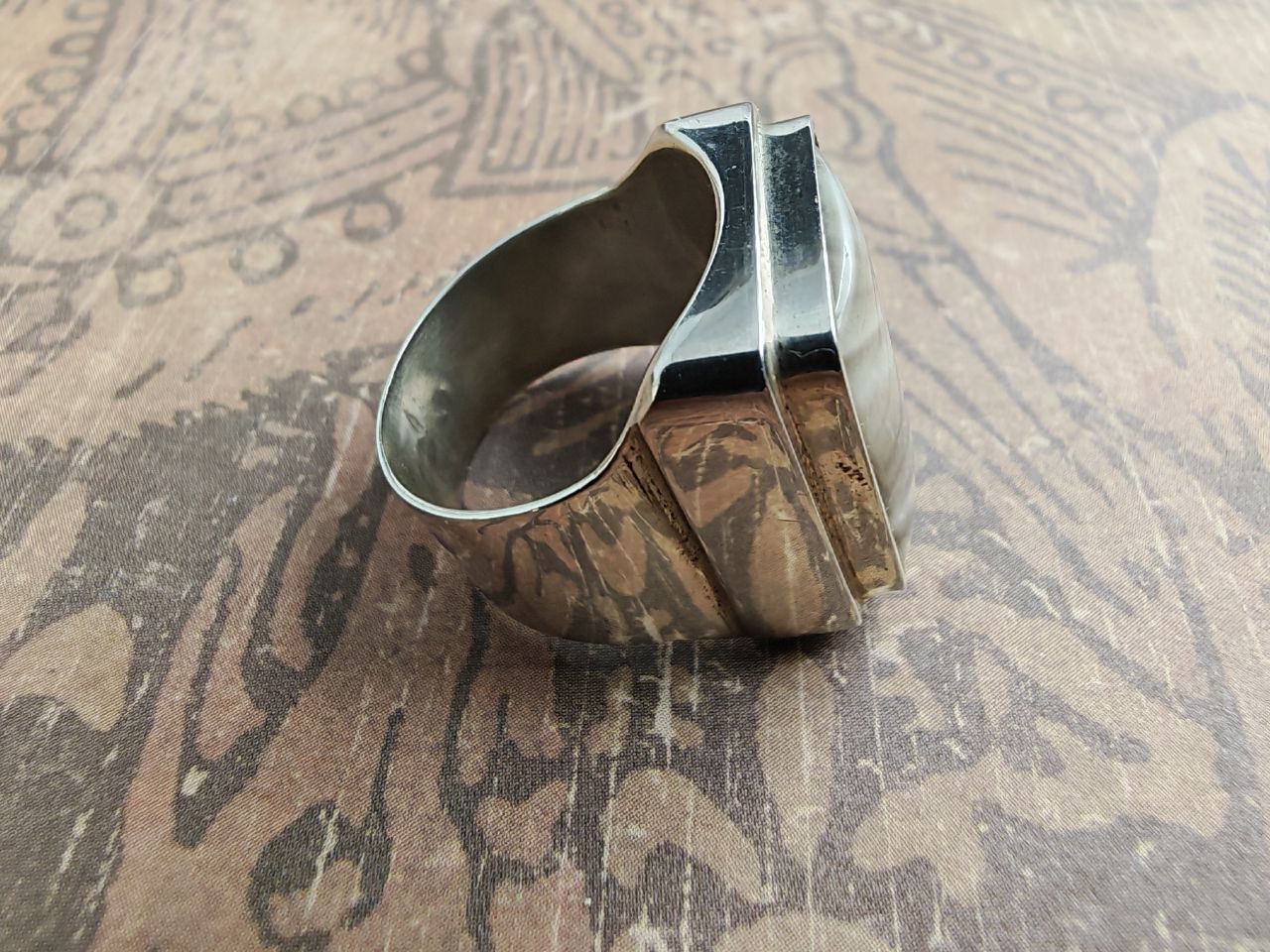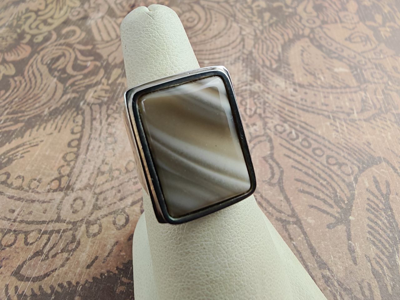 Ten pierścionek wykonany jest ze srebra próby 925 i ozdobiony kaboszonem z naturalnego krzemienia pasiastego o kształcie prostokątnym i wymiarach 20 x 16 mm. Kamień oprawiono w ręcznie robioną, elegancką oprawę, wyglądającą jak sygnet.