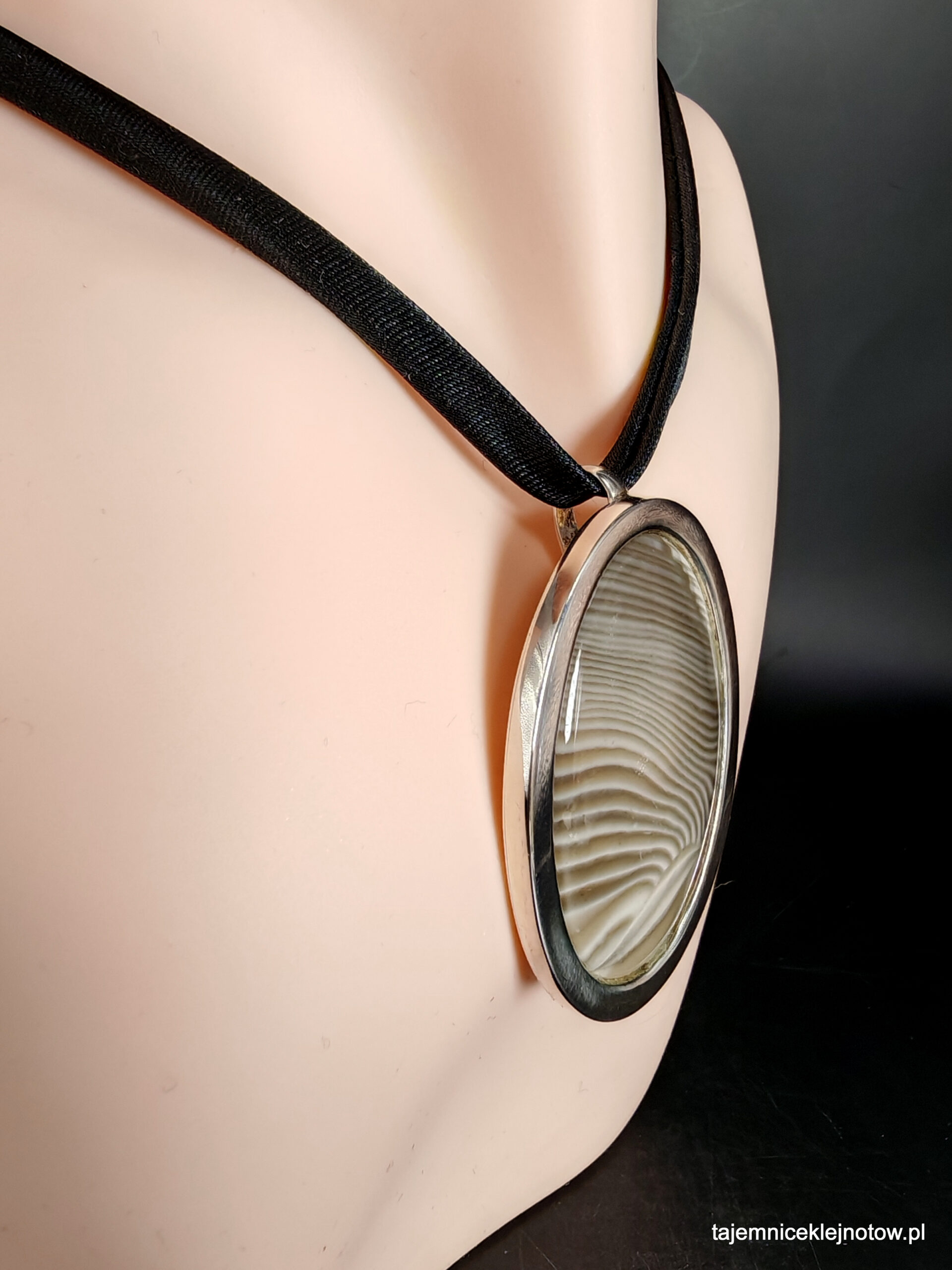 Oprawa wisiora z krzemieniem pasiastym jest autorskim projektem naszej pracowni. Wykonano ją ręcznie według tradycyjnych metod jubilerskich. Stosowana przez nas technika obróbki srebra polega na ręcznym nadawaniu kształtu przedmiotowi metalowemu poprzez jego kucie i walcowanie. Jest to metoda wymagająca czasu i cierpliwości, ale dzięki jej zastosowaniu następuje poprawa właściwości mechanicznych materiału. Wytworzone tą techniką przedmioty są trwalsze od przedmiotów odlewanych i lepiej przyjmują poler.