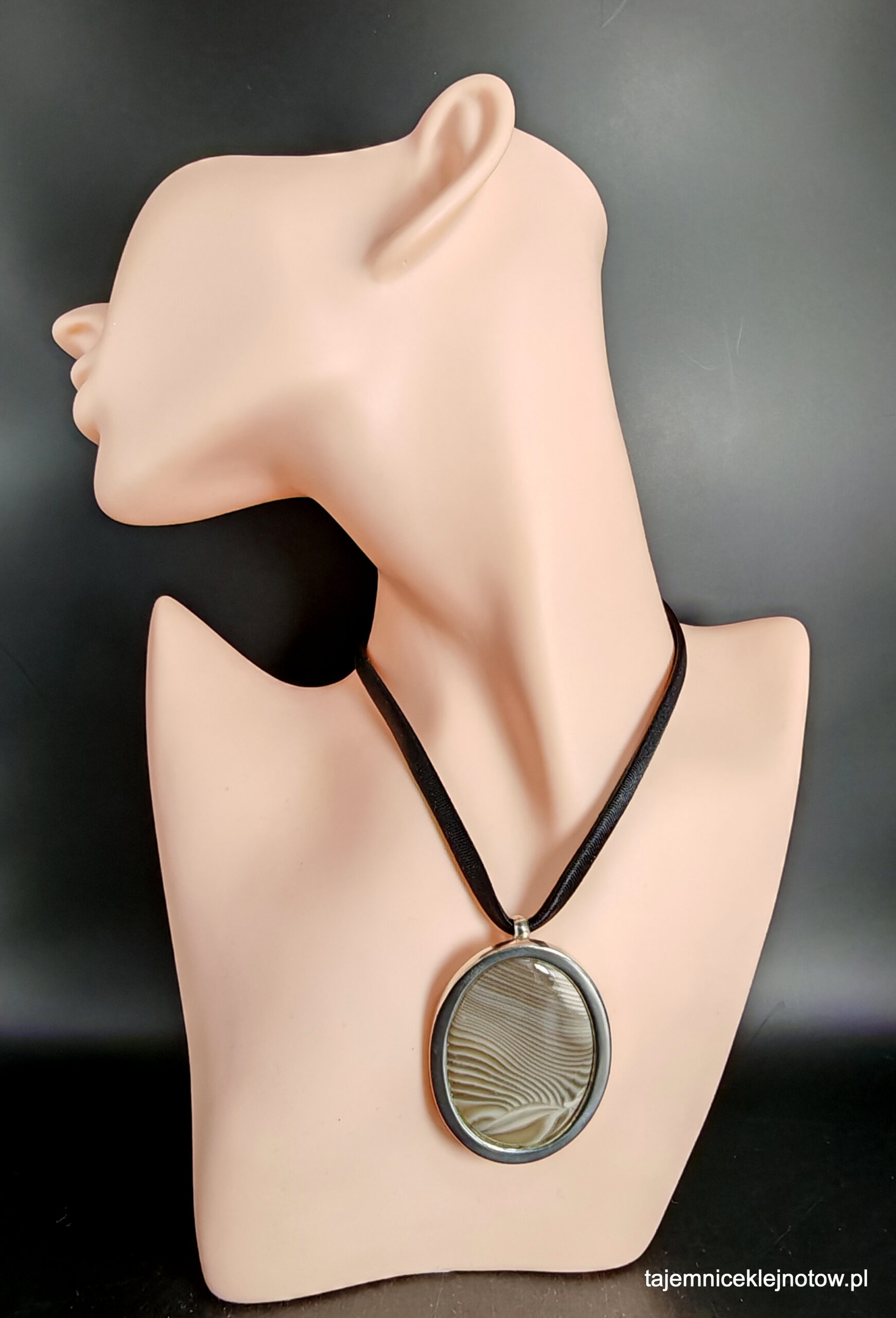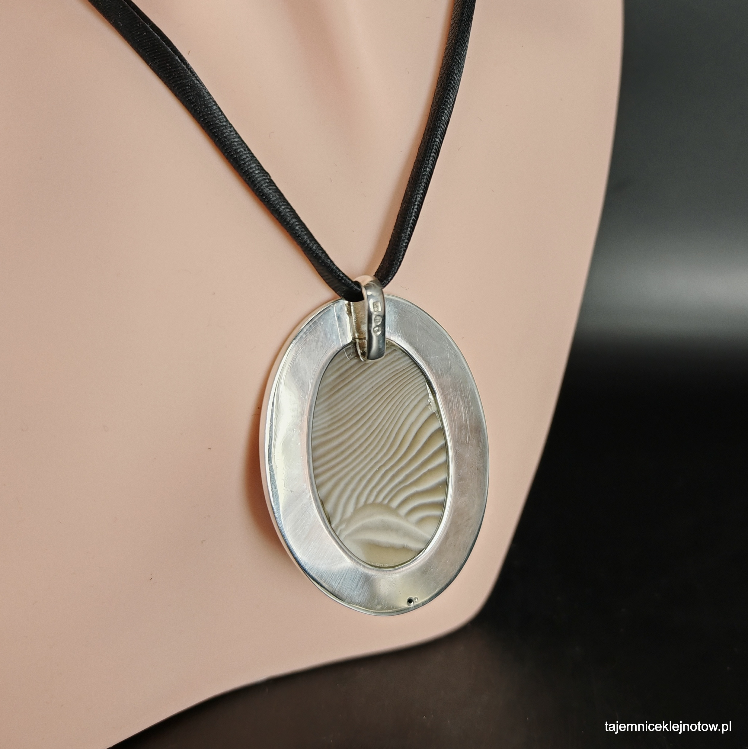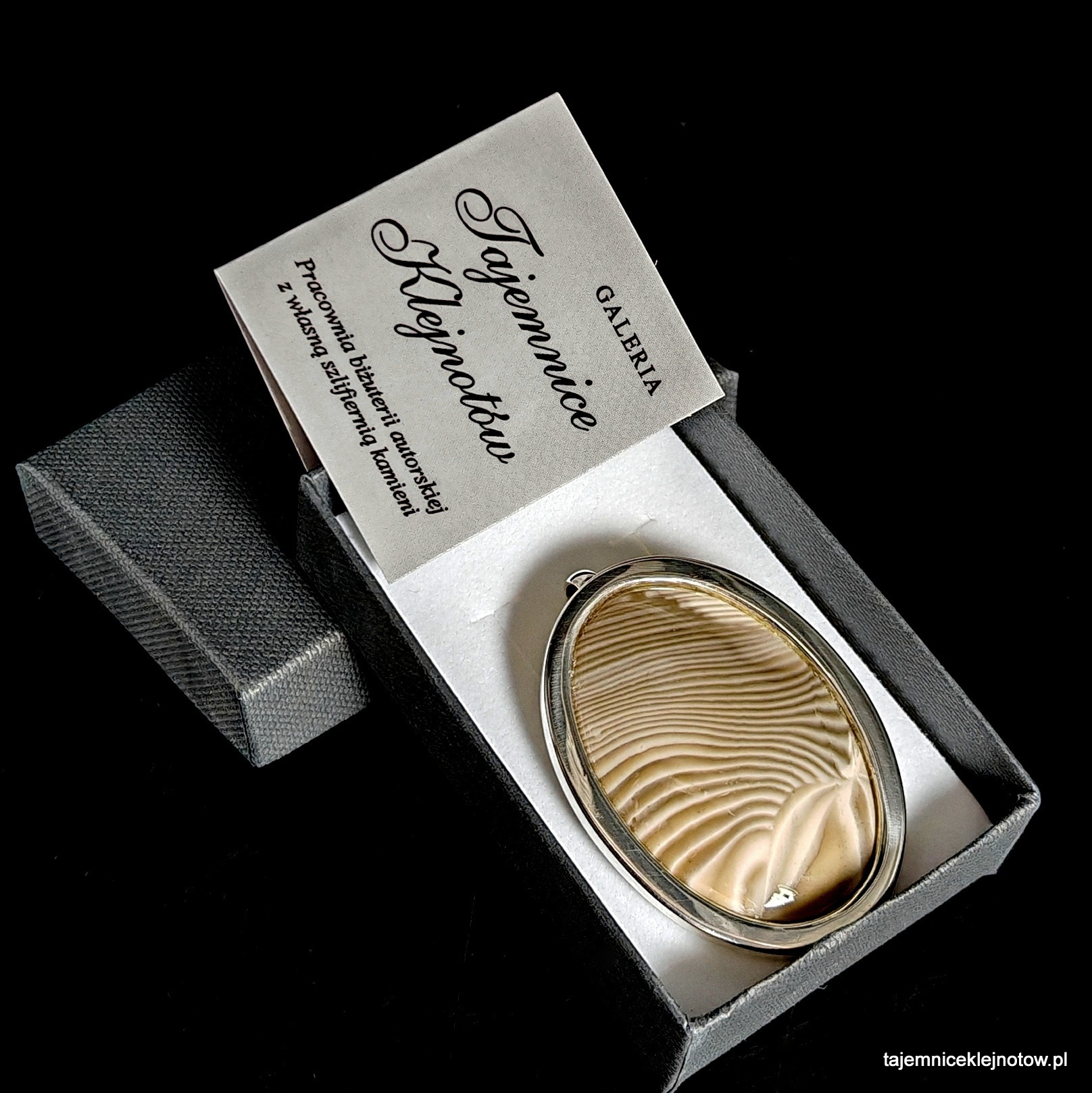 Wisior srebrny z krzemieniem pasiastym ŁADNY spodoba się wszystkim nowoczesnym kobietom, które cenią sobie prostotę i elegancję. Oprawa nieco odbiega od klasycznych wzorów, ale jest pomyślana tak, by nie przyćmiewać urody krzemienia pasiastego, który jest zdecydowanie najważniejszym elementem wisiora.