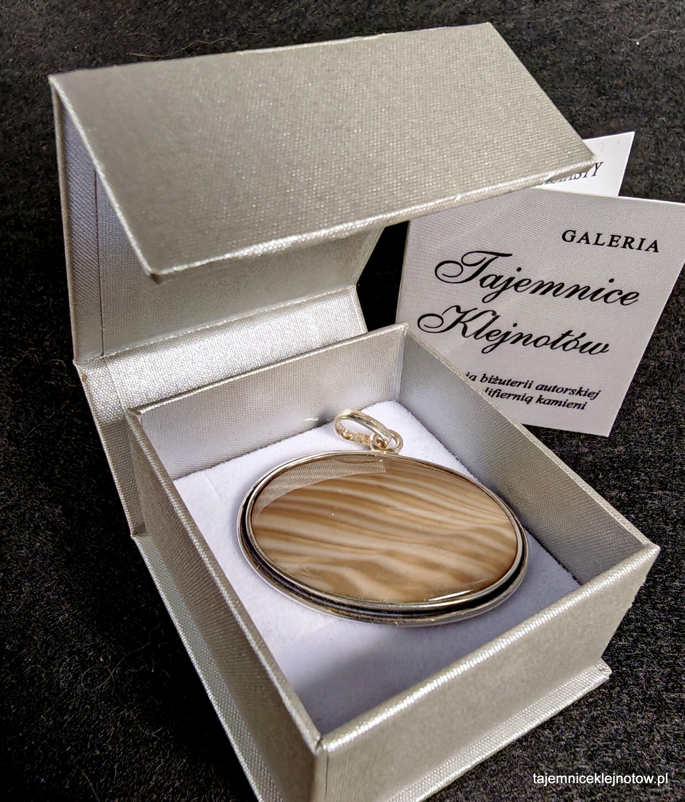 Owalny wisior z krzemienia pasiastego w poziomej oprawie srebrnej (próba 925). Kamień został wyszlifowany i oprawiony w naszej pracowni w Świętej Katarzynie. Krzemień pasiasty to wyjątkowy kamień ozdobny z Gór Świętokrzyskich.